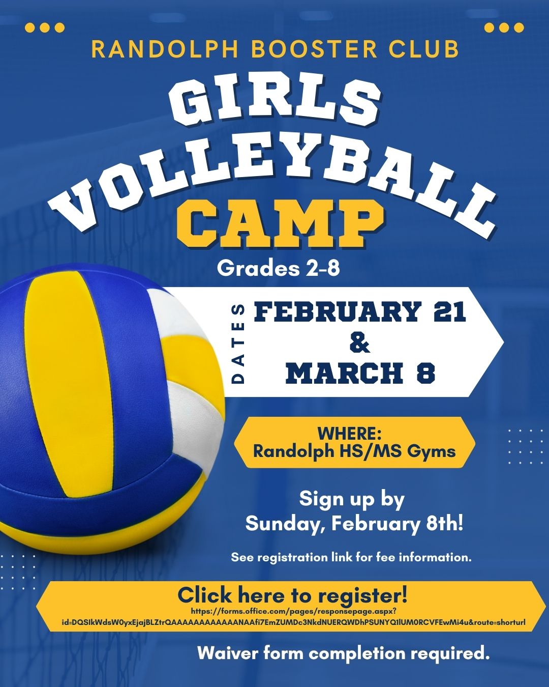 February 2, 2026 Booster Club Gr 2-8 Girls Volleyball Skills Camp - February 21st & March 8th REQUIRED WAIVER FORM - CLICK HERE